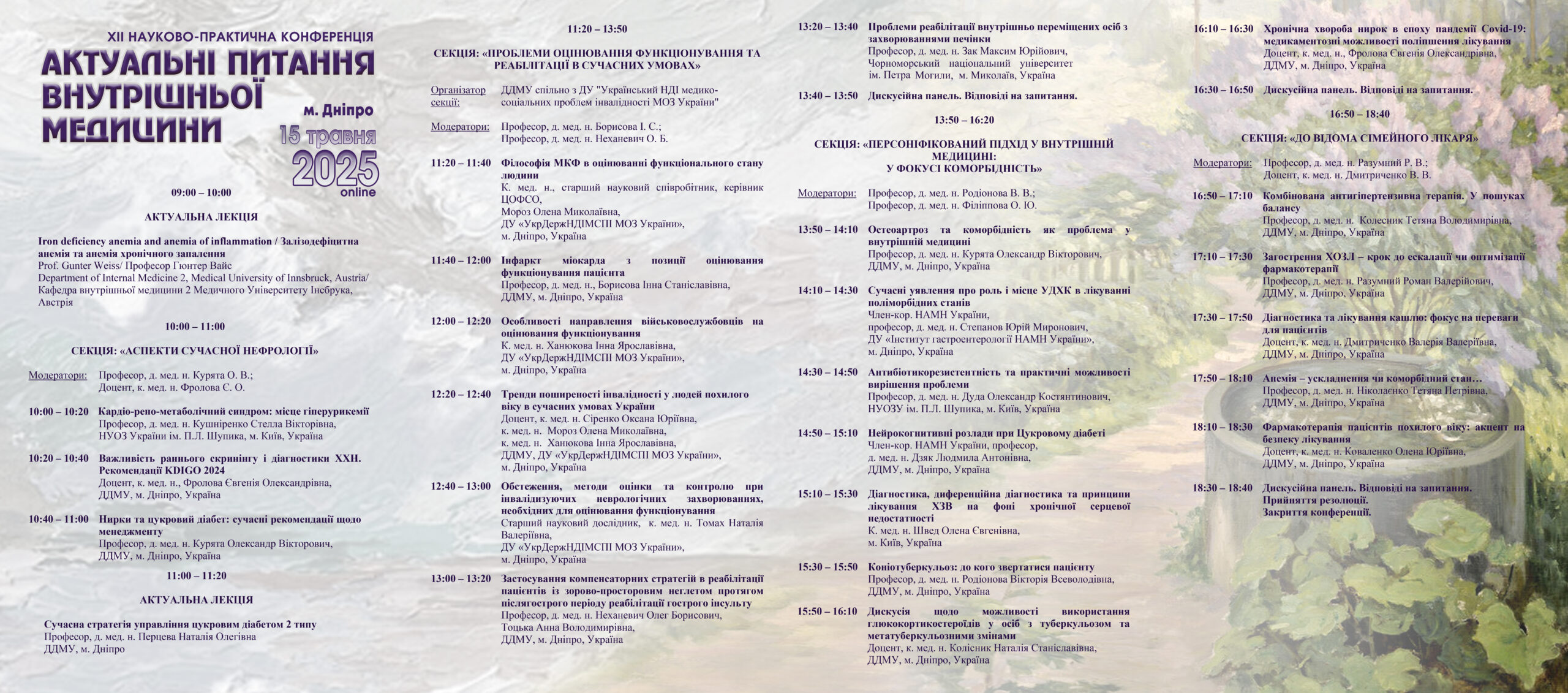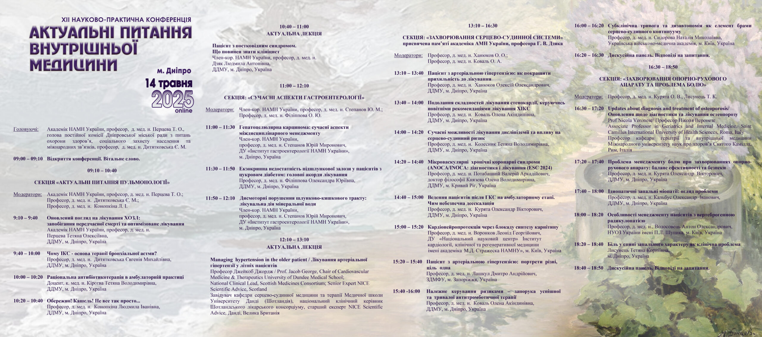 14 - 15 травня 2025 року в місті Дніпро відбулася у 12-й Науково-практичній конференції АКТУАЛЬНІ ПИТАННЯ ВНУТРІШНЬОЇ МЕДИЦИНИ 2025 в онлайн форматі.